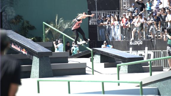 A brasileira conseguiu administrar o aparente nervosismo e somente em sua última volta mostrou a que tinha vindo. Usou bem a pista, acertou manobras com muita segurança e fechou a jam session com um potente frontside boardslide no corrimão maior. 87.33 e festa brasileira na pista de Street!